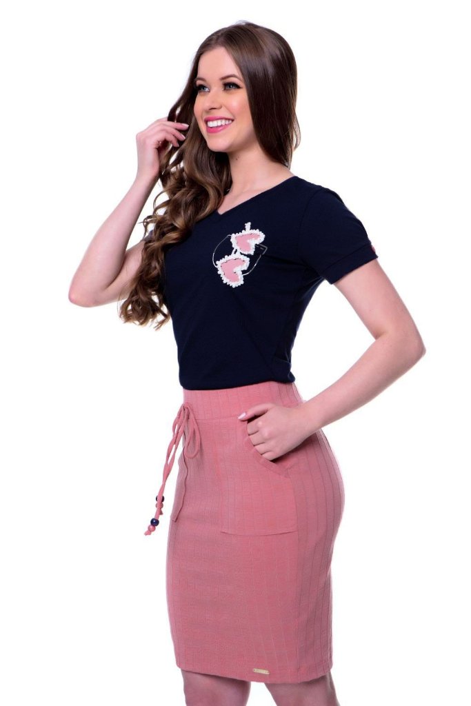 Composto por duas peças, esse lindo conjunto apresenta blusa em malha com decote em v, mangas curtas com detalhe de botão, estampa e bordado manualmente em pérolas. A saia foi confeccionada em malha canelada, de modelagem reta e justa, possui comprimento na altura dos joelhos, bolsos funcionais frontais e roletê com ponteira.